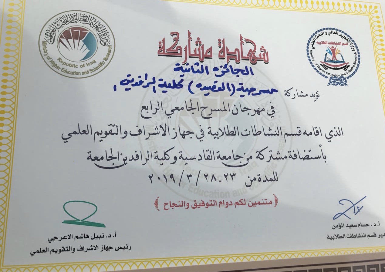 فوز كلية الرافدين 27 مارس، 2019 نرمين اعلام فازت كلية الرافدين الجامعة يوم الاربعاء الموافق 2019/3/27, في مهرجان المسرح الجامعي الرابع بالمركز الثاني وهذه صور خاصة عن هذا المهرجان. كلية الرافدين الجامعة ثلاثون عاماً من الابداع والتميز لجنة الاعلام…