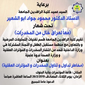 برعاية الاستاذ الدكتور محمود جواد أبو الشعير عميد كلية الرافدين الجامعة وتحت شعار ( معا لعراق خال من المخدرات ) ستقيم الكلية قسم تقنيات التحليلات المرضية، وبالتعاون مع منظمة الطفل واللجنة المشتركة في وزارة الداخلية ووزارة الصحة في الساعة العاشرة صباحا من يوم الثلاثاء الموافق ٢٦/٢/٢٠١٩. ندوة علمية تحت عنوان مخاطر تداول وتناول المخدرات والمؤثرات العقلية، على قاعة المؤتمرات في بناية البنوك والدعوة عامة للجميع.