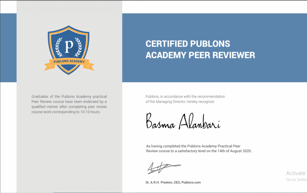 حصلت التدريسية الدكتورة بسمة فتحي الانباري قسم طب الاسنان / فرع امراض وجراحة ما حول الاسنان على شهادة مراجع و مقيم بحوث معتمدة من قبل منصة publons التابعة لقاعدة بيانات كلاريفيت الامريكية وذلك بعد اكمالها لمتطلبات التخرج من publon academy المعنية بتأهيل كادر متقدم من مقيمي البحوث و المراجعين المعتمدين ،حيث قامت بإكمال عشر دورات تدريبية مع تقييمي لبحثين منشورين تحت اشراف مدرب معتمد من قبل الاكاديمية ،و بذلك تم ادراجها ضمن قائمة المراجعين الاقران المعتمدين certified publons peer reviewer .