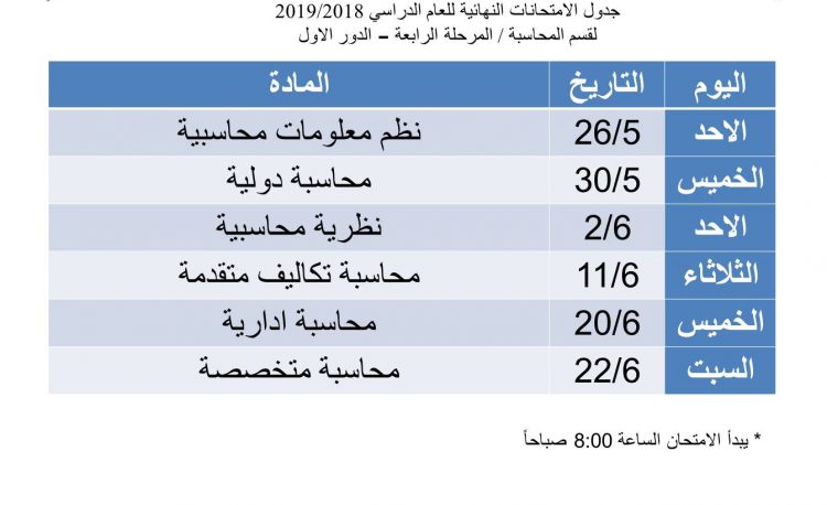 جدول الامتحانات النهائية (لقسم المحاسبة)الوحلة الرابعة الدور الاول للعام الدراسي ٢٠١٩/٢٠١٨