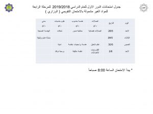 جدول الامتحانات النهائية للمرحلة الرابعة للعام الدراسي ٢٠١٩/٢٠١٨ للمواد الغير مشمولة بالامتحان التقويمي (الوزاري )