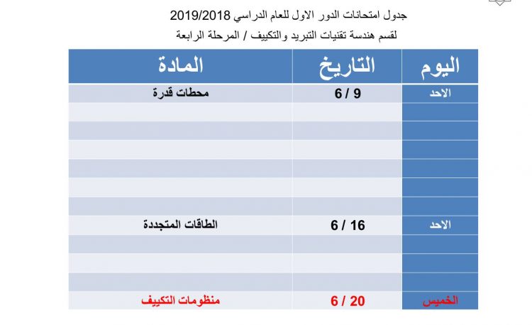 تم تعديل جدول امتحانات قسم(هندسة تقنيات التبريد والتكييف) المرحلة الرابعة الدور الاول للعام الدراسي ٢٠١٩/٢٠١٨
