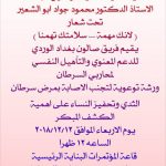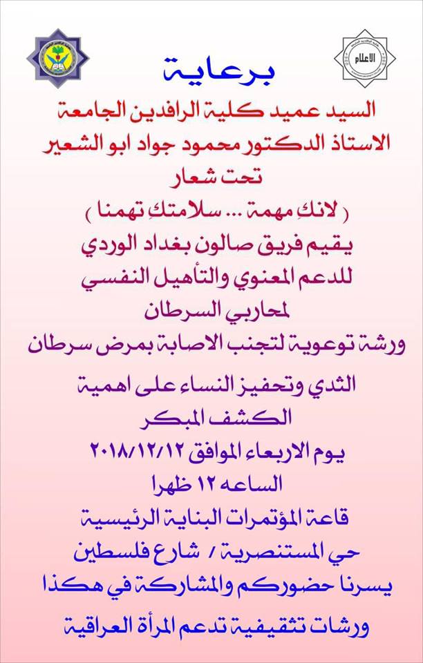 برعاية السيد عميد كلية الرافدين الجامعة الاستاذ الدكتور محمود جواد ابو الشعير وتحت شعار (لانكِ مهمة … سلامتكِ تهمنا) يقيم فريق صالون بغداد الوردي للدعم المعنوي والتأهيل النفسي لمحاربي السرطان ورشة توعوية لتجنب الاصابة بمرض سرطان الثدي وتحفيز النساء على اهمية الكشف المبكر يوم الاربعاء الموافق ٠١٨/١٢/١٢ الساعه ١٢ ظهراً قاعة المؤتمرات البناية الرئيسية / شارع فلسطين يسرنا حضوركم والمشاركة في هكذا ورشات تثقيفية تدعم المرأة العراقية