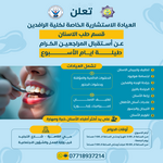تعلن عيادات طب الاسنان عن استقبال المراجعين الكرام طيلة ايام الاسبوع لعلاج كافة مشاكل الاسنان على النحو الاتي :-ابتسامة هوليود-تنظيف وتبيض الاسنان-الحشوات الدائمية والمؤقتة وحشوات الجذر-تغليف الاسنان (سيراميك ،زاركون )…