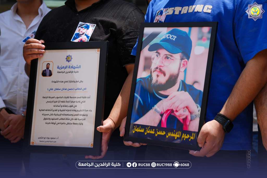 بقلوب حزينة ومؤمنة بقضاء الله وقدره أقامت كلية الرافدين الجامعة وقفة حداد وقراءة سورة الفاتحة على روح الطالب حسن عدنان سلمان من طلبة قسم هندسة تقنيات الحاسوب وقد قام السيد عميد الكلية الأستاذ الدكتور محمود جواد أبو الشعير المحترم بتقديم شهادة تخرج رمزية للطالب وفاءً لذكراه الطيبة وتقديراً لأخلاقه العالية وسلوكه المميز ومساهمته الإيجابية خلال مسيرته الدراسية جاء ذلك بمشاركة الأستاذ المساعد الدكتور سامر سعيد عيسى المحترم معاون العميد للشؤون العلمية والأستاذ الدكتور أنور جعفر محمد المحترم رئيس قسم هندسة تقنيات الحاسوب إلى جانب عدد من أساتذة القسم وطلبته نسأل الله أن يتغمده بواسع رحمته ويسكنه فسيح جناته ويلهم أهله وذويه الصبر والسلوان