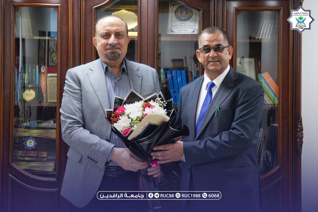 تلقى السيد رئيس الجامعة الاستاذ الدكتور محمود جواد ابو الشعير المحترم التهنئة من عميد كلية الادارة والاقتصاد في جامعة بغداد الاستاذ الدكتور صباح منفي المحترم بمناسبة تحول كلية الرافدين الى جامعة وأشاد الدكتور صباح بهذا الإنجاز الأكاديمي الكبير الذي يعكس الجهود المخلصة والقيادة الحكيمة للأستاذ الدكتور محمود جواد أبو الشعير، متمنياً له دوام التوفيق والسداد في مسيرته العلمية لخدمة التعليم العالي في العراق.